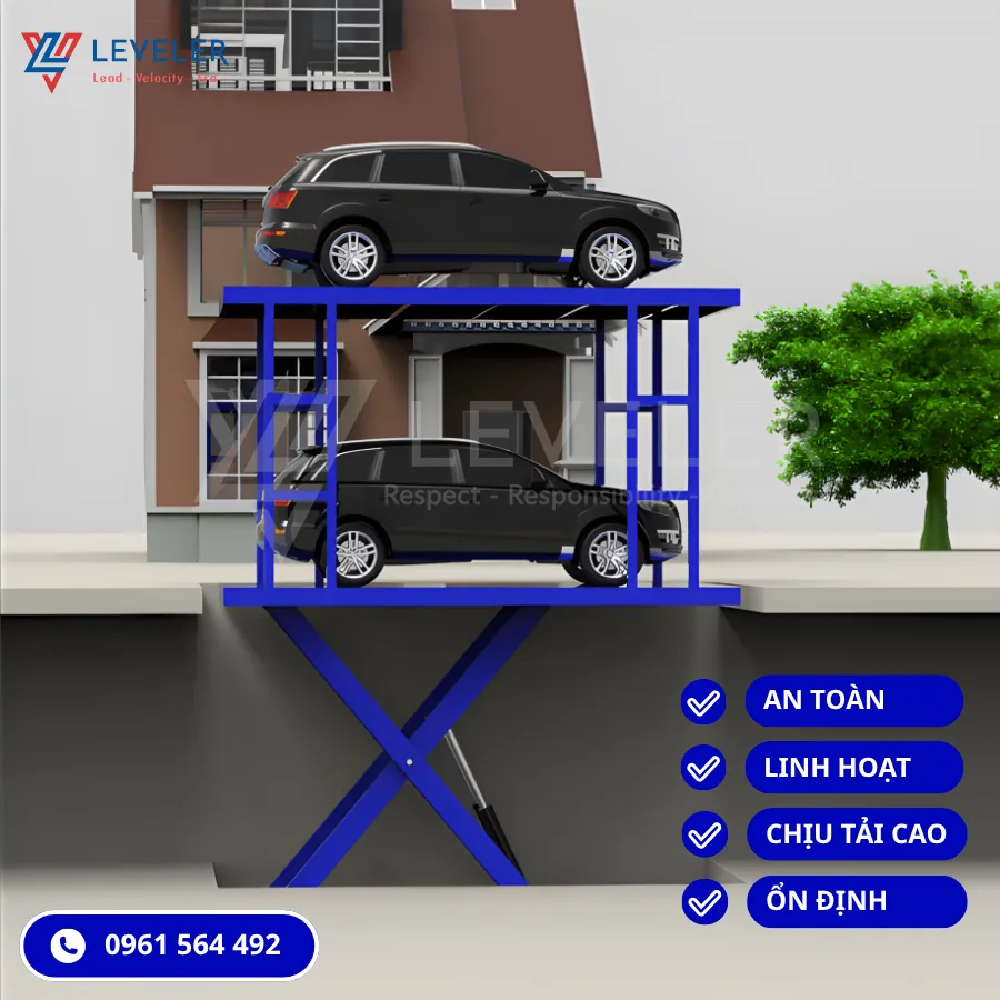 Bàn Nâng Ô Tô Thủy Lực 2 Tầng Leveler (Two-Level Hydraulic Car Lift) như một giải pháp thông minh, giúp tăng gấp đôi diện tích đỗ xe trên cùng một mặt bằng.