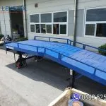 Cầu dẫn xe nâng có lan can thép hộp, sản phẩm hỗ trợ xe nâng lên xuống đóng dỡ hàng hóa, với lan can thép hộp có chỉ dẫn an toàn cho xe nâng ở mức độ cao.
