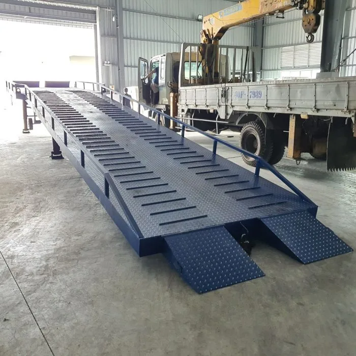 Cầu dẫn xe nâng có lan can là thiết bị không thể thiếu trong quy trình bốc xếp hàng hóa giữa container và kho xưởng, đặc biệt ở các môi trường có lưu lượng vận chuyển cao hoặc điều kiện không gian hạn chế.