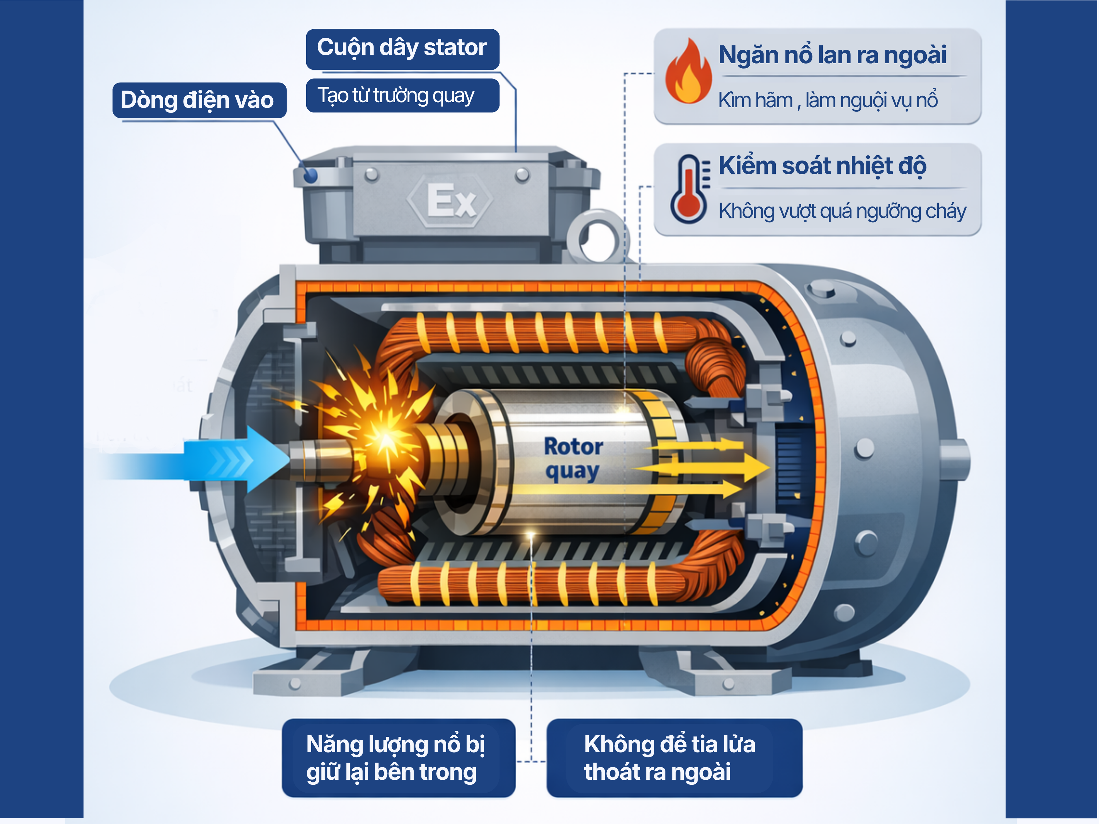 Động cơ điện phòng nổ hoạt động dựa trên nguyên lý cảm ứng điện từ để tạo chuyển động quay, đồng thời sử dụng lớp vỏ dày, cứng vững và các khe hở được thiết kế đặc biệt (khe hở chống nổ) để cách ly, ngăn chặn tia lửa điện hoặc vụ nổ bên trong lan ra môi trường dễ cháy nổ bên ngoài.
