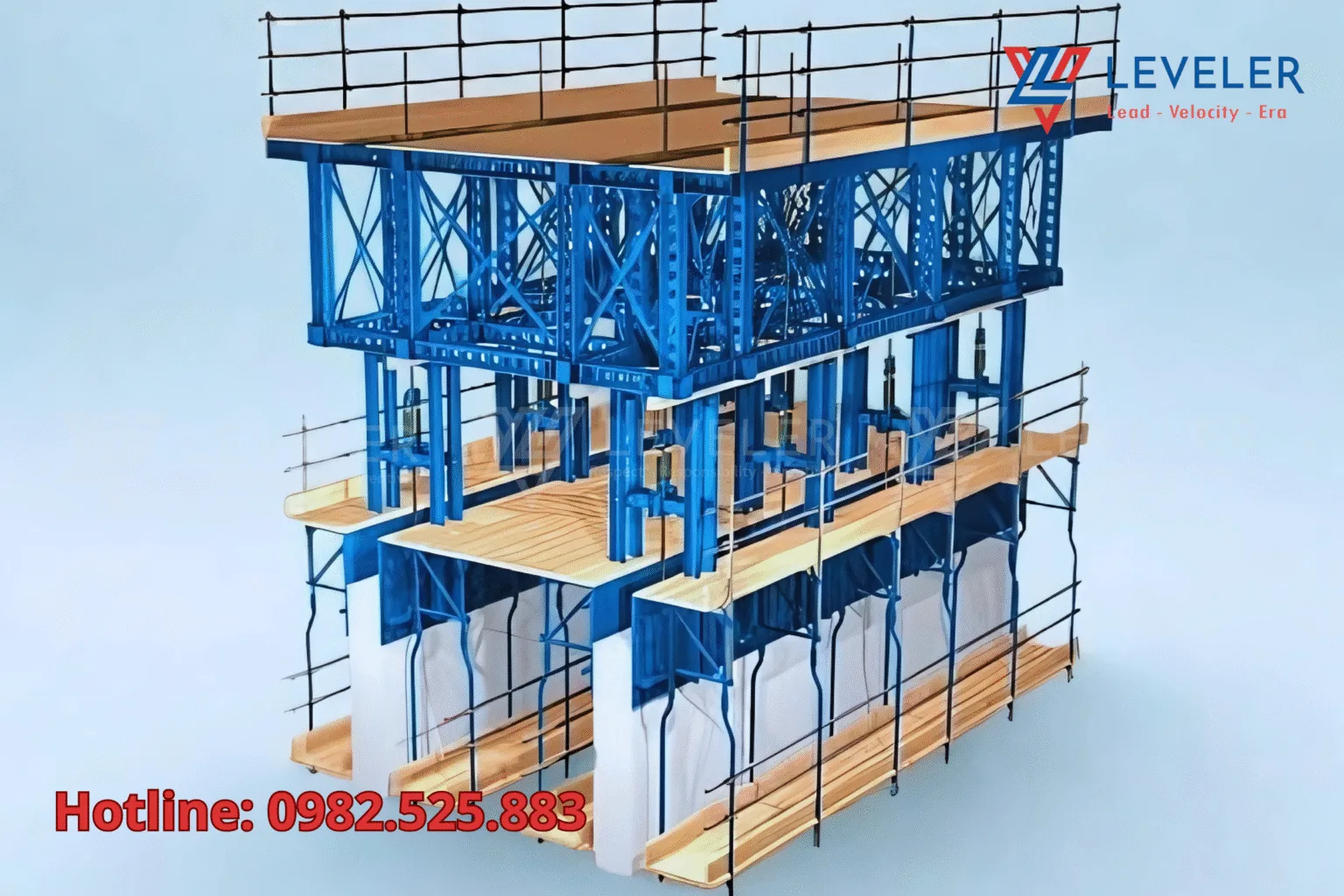 | Hệ thống thiết bị nâng (kích thủy lực, ty kích, trạm bơm dầu). | Đảm nhận vai trò nâng hạ hệ thống coppha. |