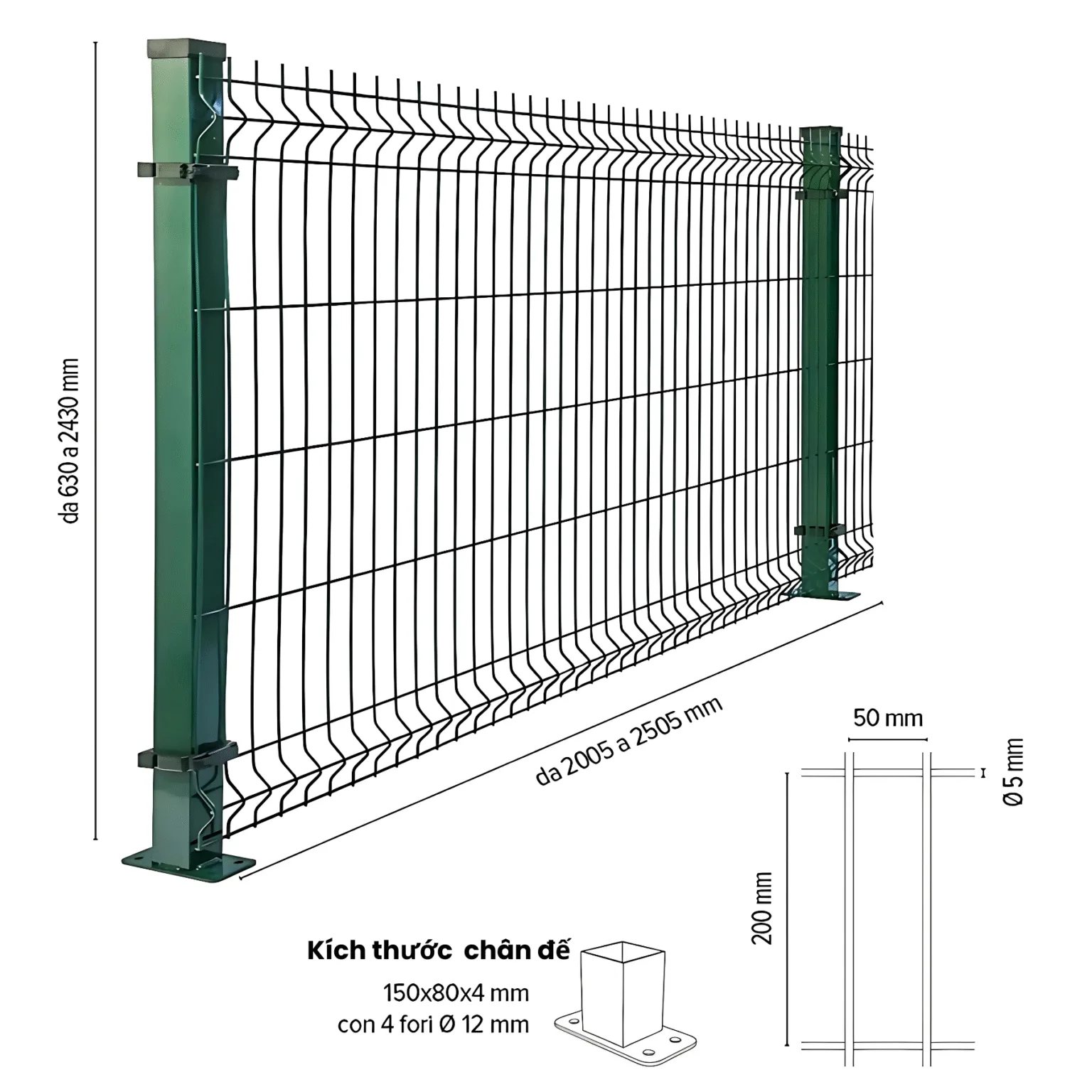 | Kích thước cột hàng rào | D48, D50, D60, D76, D90, D100… |