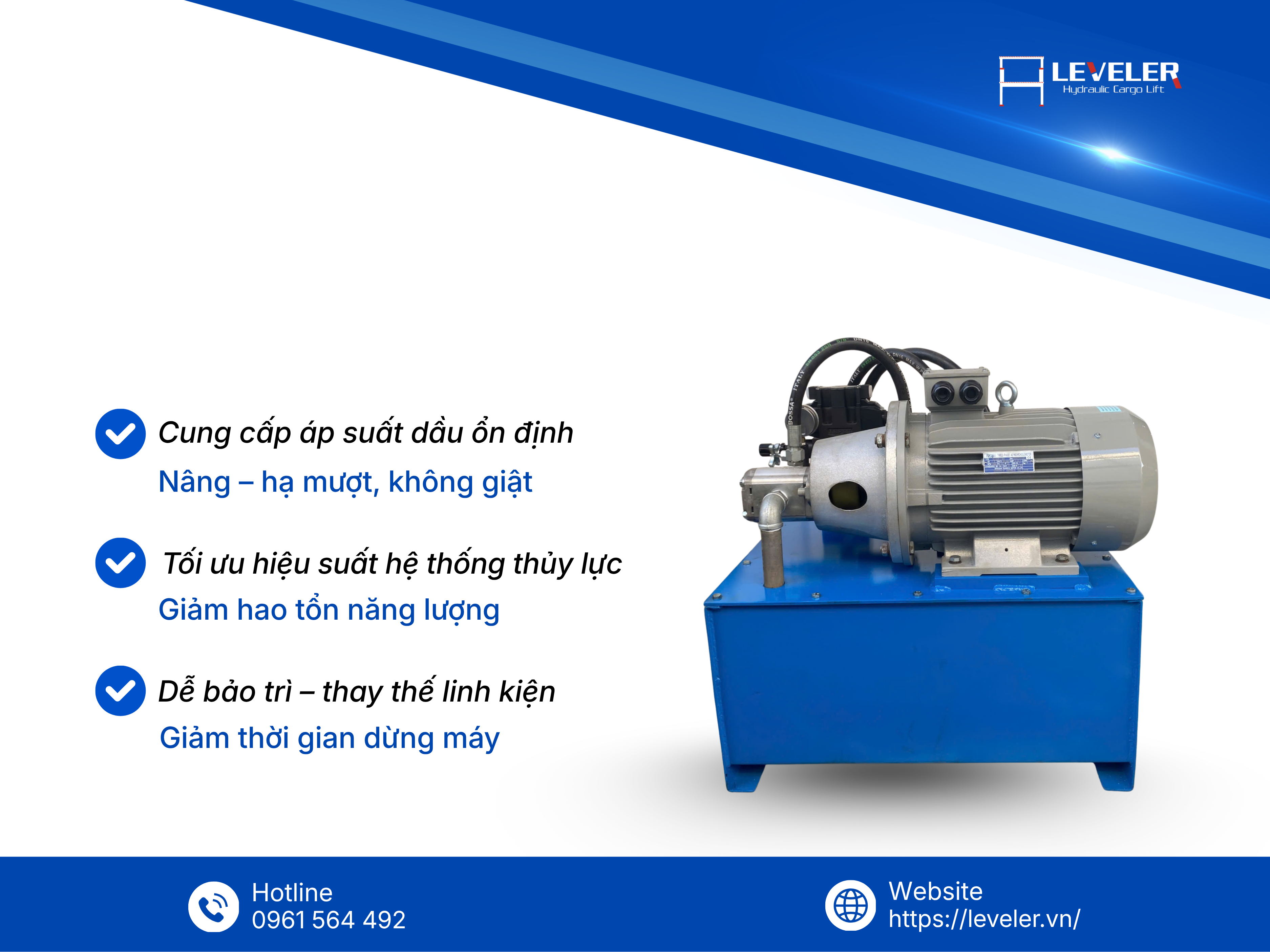 Đối với các thiết bị nâng hạ như thang nâng, sàn nâng, đặc biệt tại các đơn vị cung cấp thiết bị như LEVELER, motor giảm tốc thường được sử dụng cho bộ nguồn thủy lực để đảm bảo vận hành ổn định và an toàn. Loại motor này giúp tạo lực mạnh, đồng thời có khả năng tự hãm, hạn chế tình trạng tụt tải khi dừng.