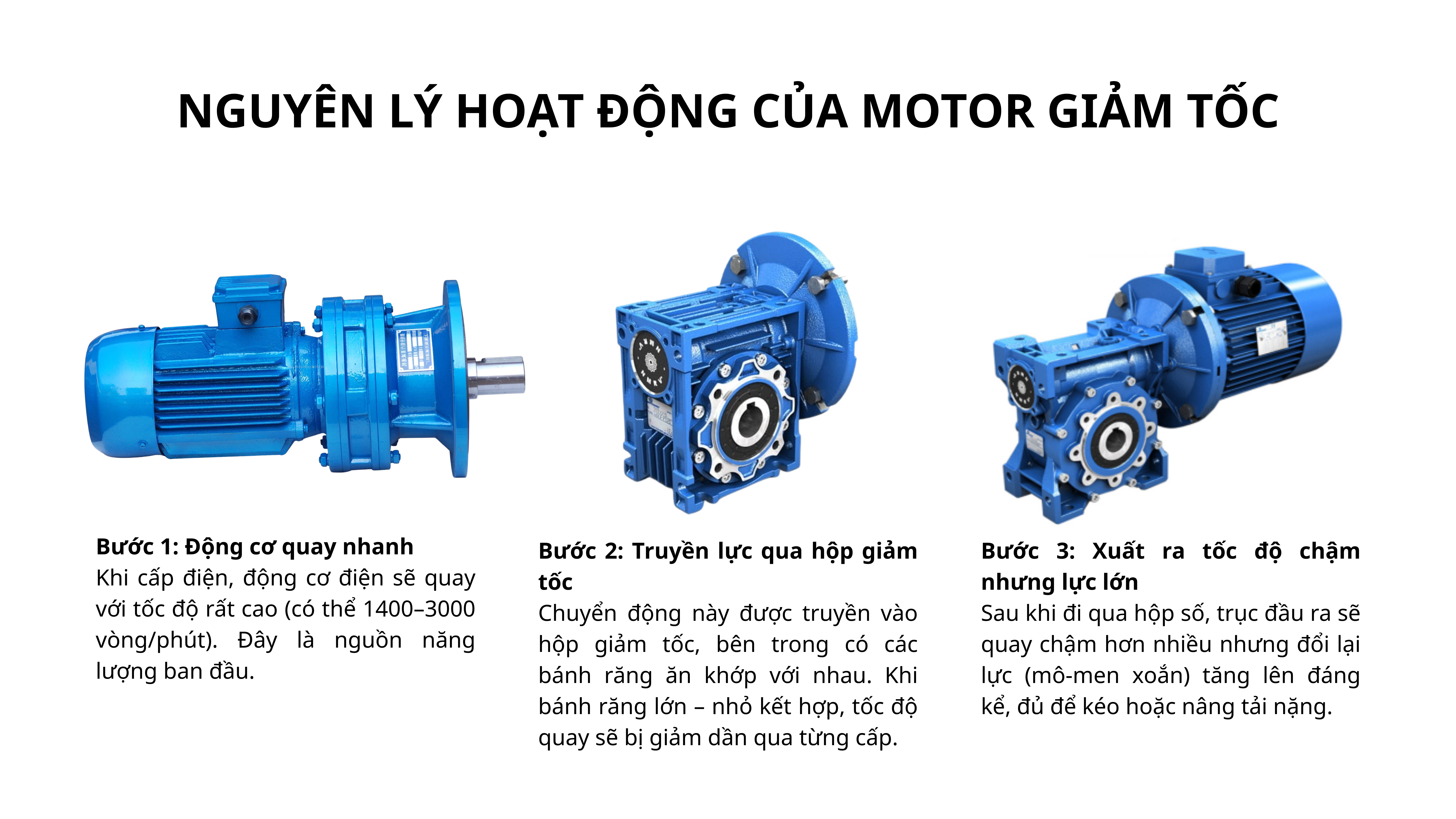 Motor giảm tốc hoạt động bằng cách cho động cơ quay rất nhanh, sau đó truyền chuyển động qua hộp giảm tốc để làm chậm lại. Khi tốc độ giảm xuống thì lực sẽ tăng lên, giúp máy có thể kéo hoặc nâng vật nặng một cách dễ dàng và ổn định hơn. Nói đơn giản, đây là quá trình đổi tốc độ lấy lực để phù hợp với nhu cầu sử dụng thực tế.