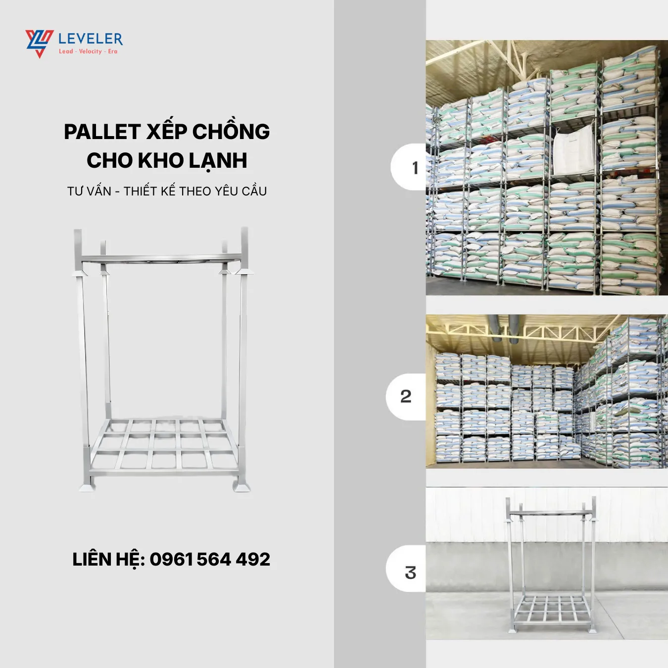 Pallet Sắt Xếp Chồng là loại pallet được thiết kế với các trụ đứng và khớp khóa ở bốn góc, cho phép xếp chồng nhiều tầng pallet (2-6 tầng) đầy hàng hóa lên nhau một cách an toàn và ổn định. Đặc điểm này giúp pallet trở thành một hệ thống kệ chứa hàng di động, tối ưu hóa việc tận dụng chiều cao và tăng mật độ lưu trữ trong kho bãi mà không cần lắp đặt kệ cố định.