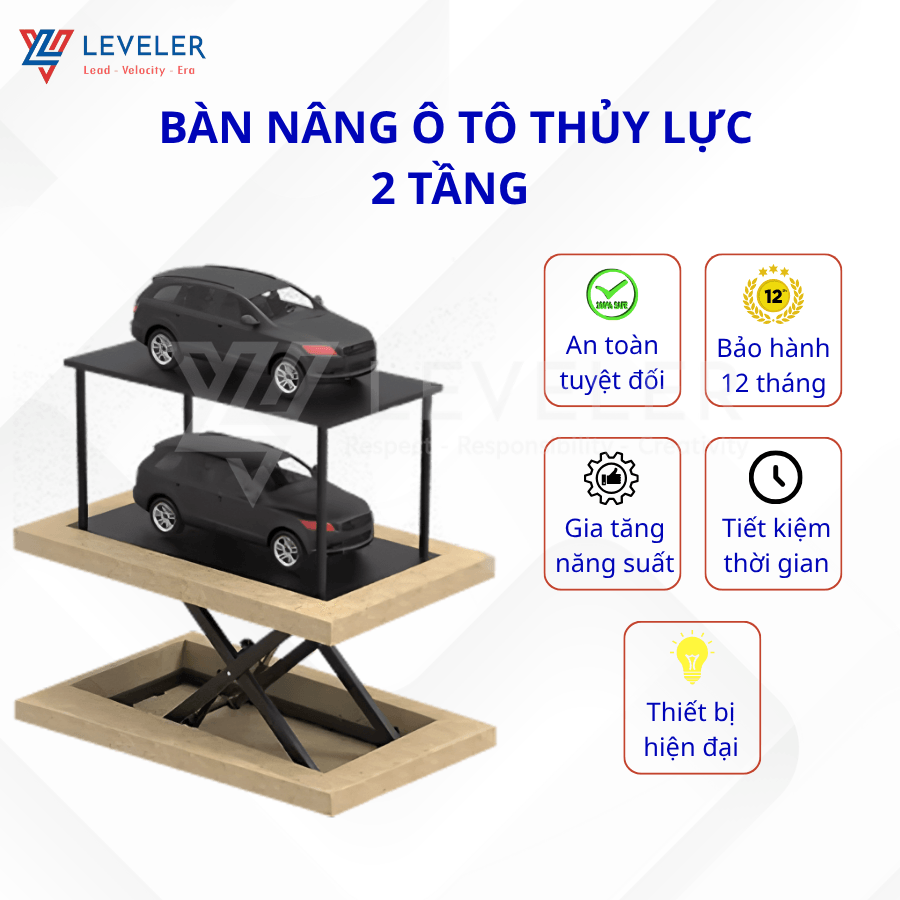 Bàn Nâng Ô Tô Thủy Lực 2 Tầng Leveler (Two-Level Hydraulic Car Lift) như một giải pháp thông minh, giúp tăng gấp đôi diện tích đỗ xe trên cùng một mặt bằng.