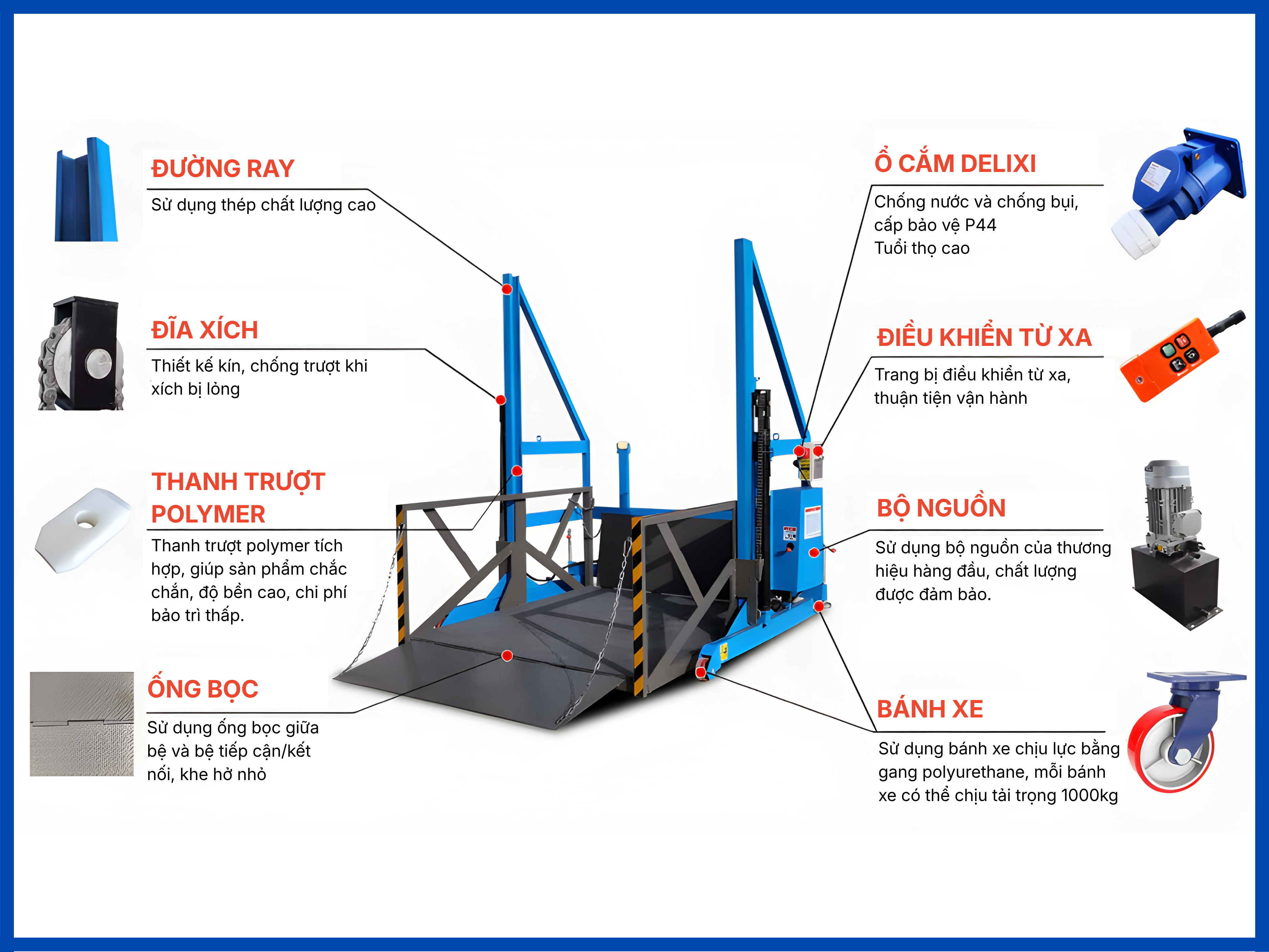 Thiết kế di động linh hoạt, không cần hố pit, dễ dàng di chuyển đến nhiều vị trí khác nhau, giúp tối ưu quy trình xếp dỡ hàng hóa.